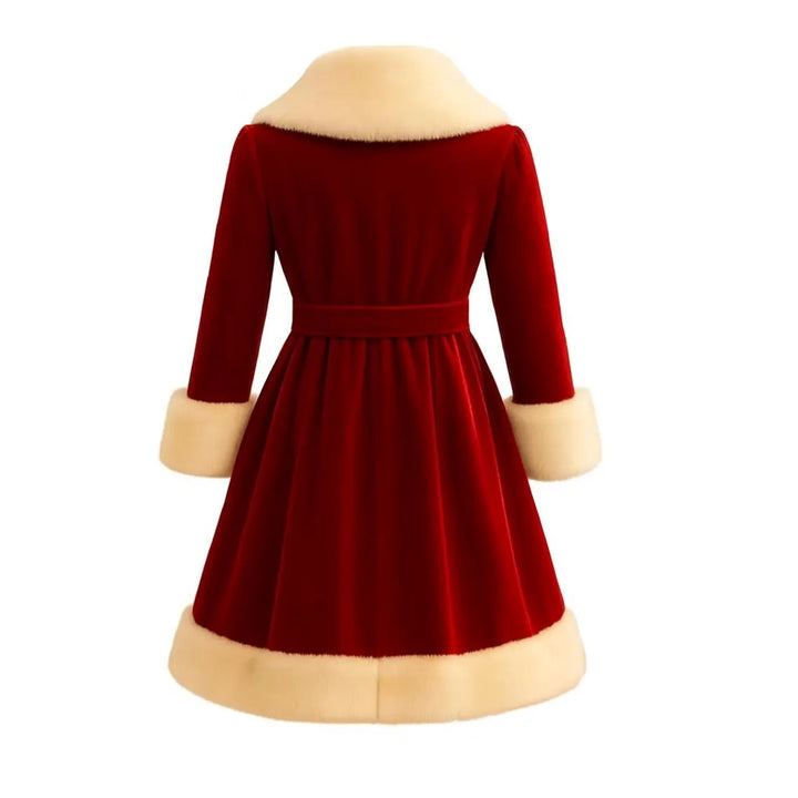 A lavish faux fur collar cascades beautifully down the front opening, creating a soft, glamorous frame that elevates the entire silhouette. The design cinches gracefully at the waist with a matching velvet belt, enhancing your figure before flowing into a knee-length A-line skirt that sways with timeless charm. Gold-toned buttons add a touch of classic refinement, while the faux fur cuffs and hemline trim complete the opulent winter look.
