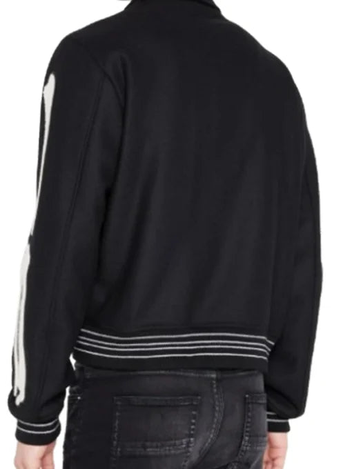 Refine your casual wardrobe with the Premium Men’s Skinbone Varsity Jacket, a sleek blend of durability and classic style. Made from high-quality wool fabric and lined with soft viscose, this black varsity jacket delivers all-day comfort while keeping your look polished. The snap-tab buttoned closure, classic collar, and ribbed cuffs add timeless varsity charm, making it ideal for everyday wear or standout street style.