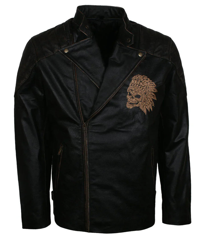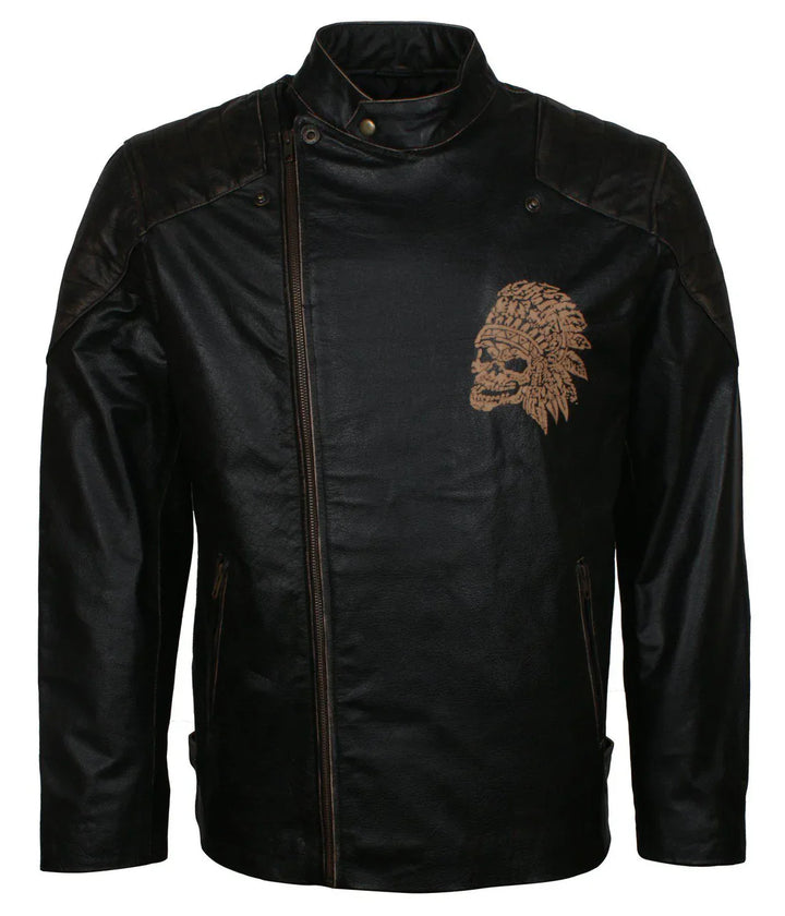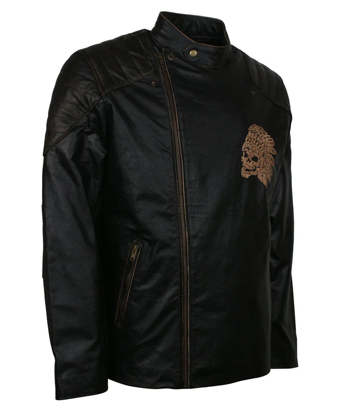 Men's Black Red Indian Skull Real Leather Biker Jacket