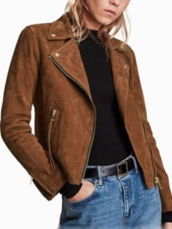 Expertly crafted by Billions costume designer, this Piper Perabo Brown Suede Moto Jacket adds a touch of edgy sophistication to your wardrobe. Made with high-quality suede and designed with intricate details, this jacket exudes confidence and style. Channel your inner boss and make a statement with this must-have piece.