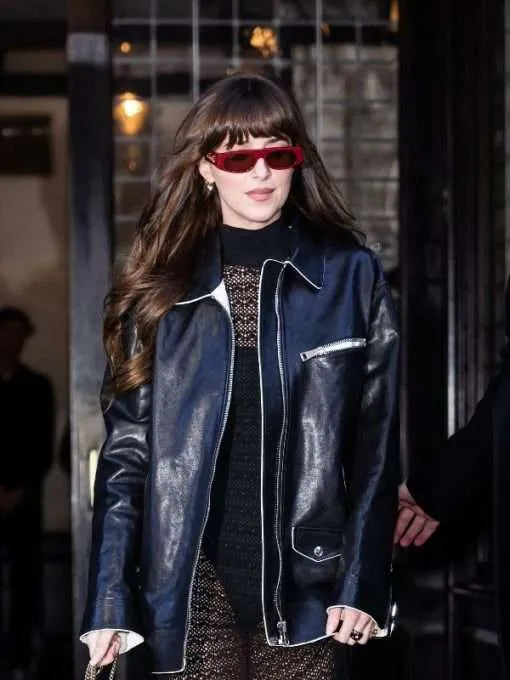 Capture Dakota Johnson’s signature NYC street style with this black leather jacket, inspired by her effortlessly chic look. Featuring clean lines, a sleek silhouette, and a timeless design, this jacket blends minimalist cool with classic sophistication. Crafted from premium real leather, it’s the perfect staple for layering year-round ideal for fashion enthusiasts who value understated elegance and enduring style.