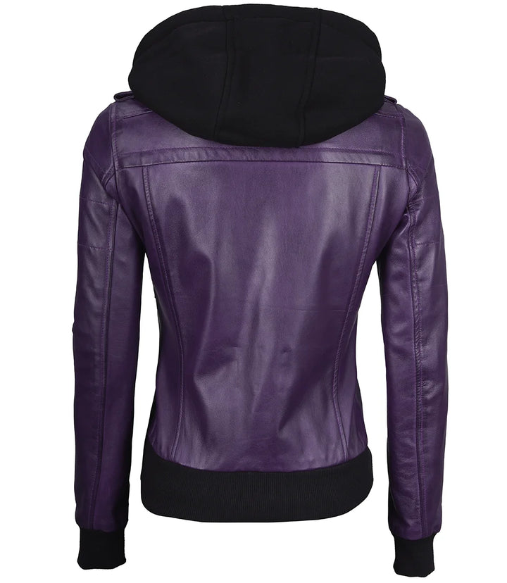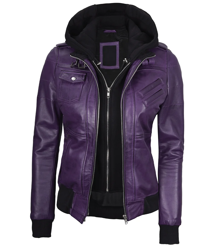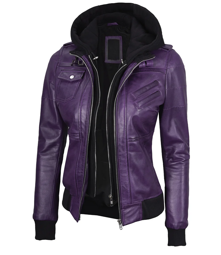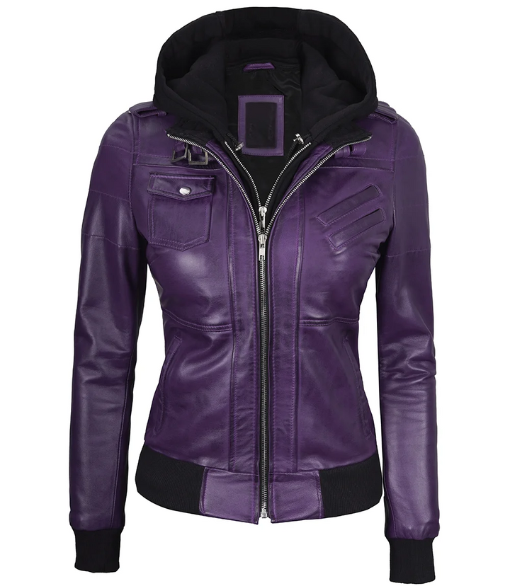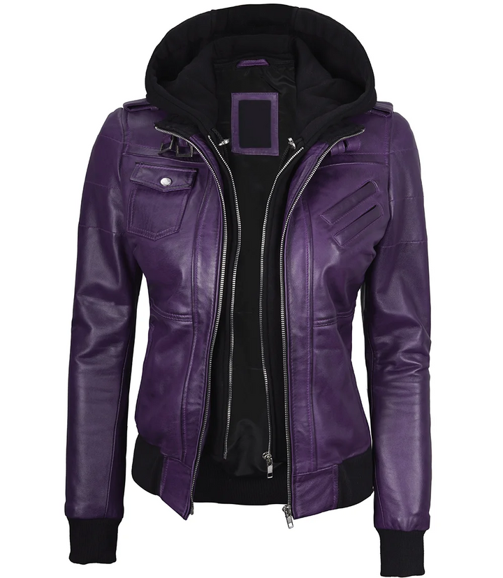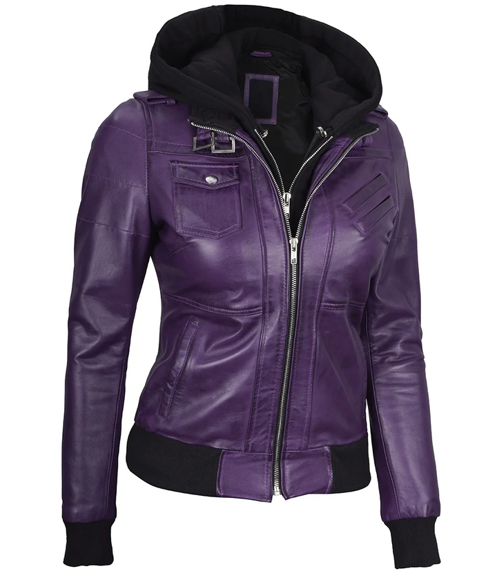 Upgrade your style with the Edinburgh Women Purple Bomber Leather Jacket. Made with genuine leather, this jacket features a removable hood for versatility. Stay warm and stylish with this essential addition to your wardrobe.