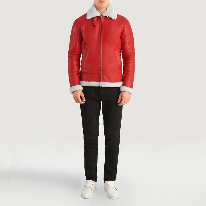 Embrace the festive spirit and stay warm in unmistakable style with our Men’s Festive Red Shearling Leather Aviator Bomber Jacket. Expertly crafted from premium genuine leather, this standout winter piece instantly elevates any cold-weather look with its bold red color adding the perfect touch of holiday cheer.