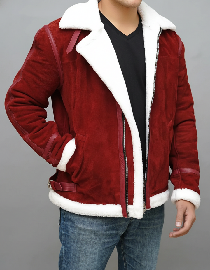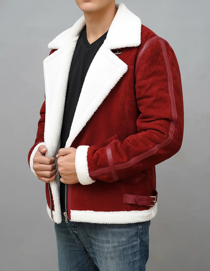 Celebrate the season in bold style with our Men’s Red Suede Shearling Jacket, the perfect blend of festive charm, rugged sophistication, and winter-ready warmth. Crafted from premium red suede and fully lined with plush white shearling, this aviator-inspired jacket delivers exceptional insulation and comfort during the coldest months.