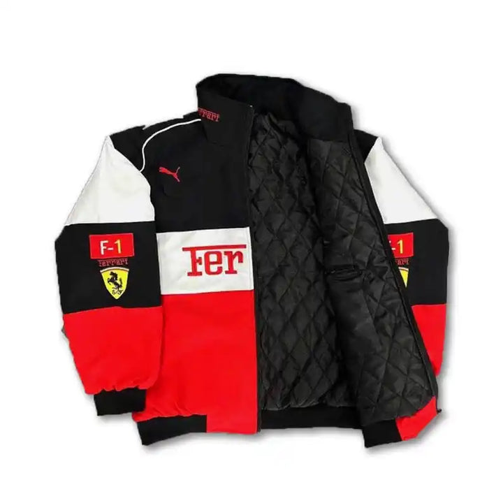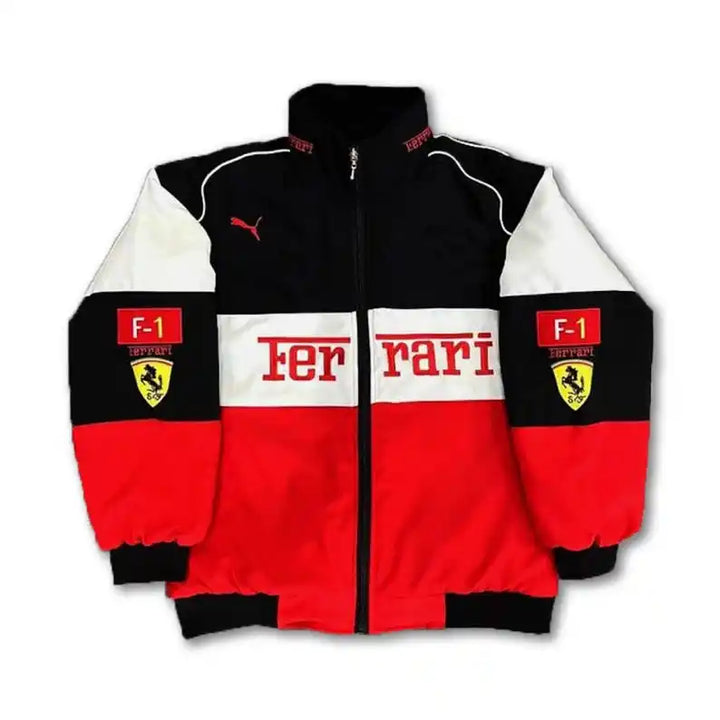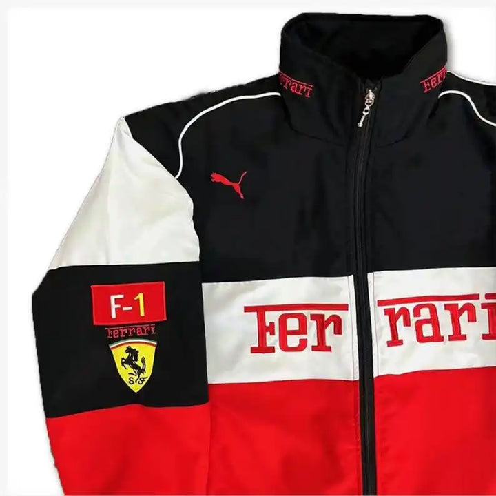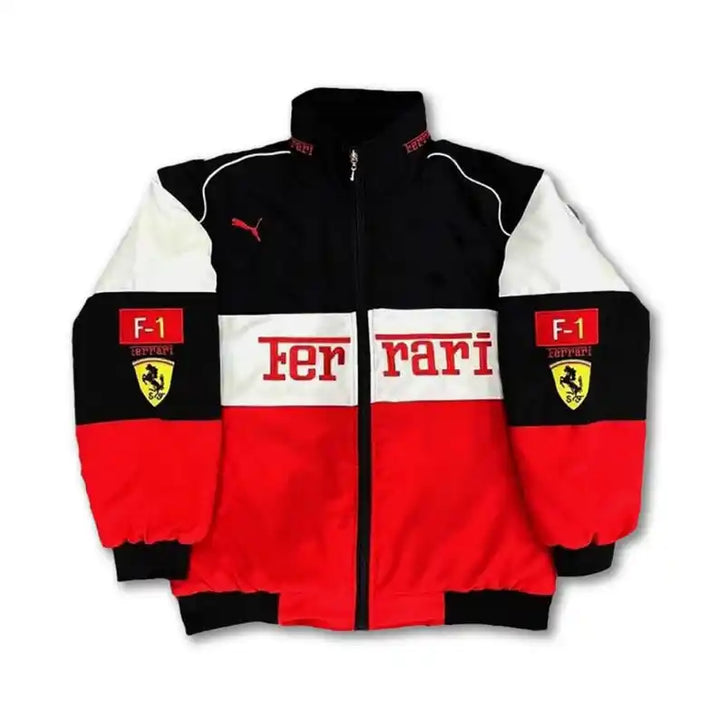 Rev up your style with this striking Ferrari F1 Racing Jacket the perfect fusion of motorsport passion and bold fashion. Showcasing iconic Ferrari and Puma logos, this dynamic red, black, and white color block design captures the thrill of Formula 1 while delivering standout streetwear appeal. Ideal for racing fans and speed-inspired trendsetters alike.