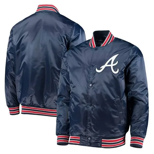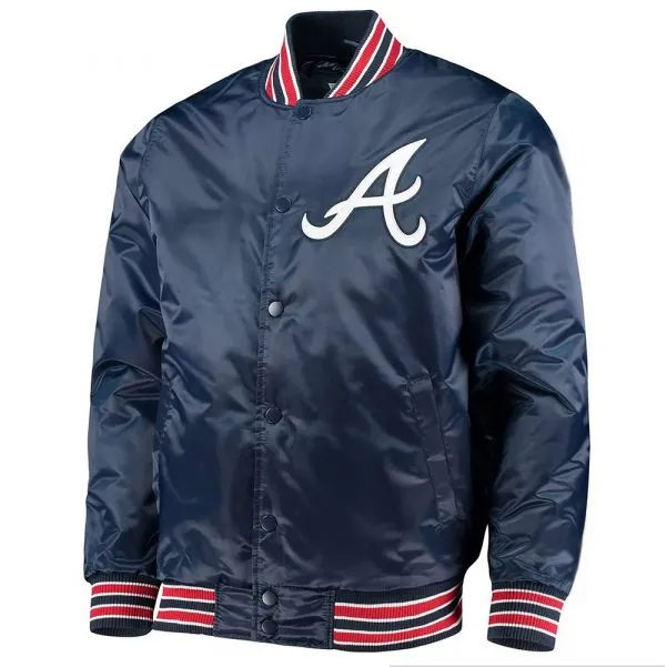 The Atlanta Braves The Diamond Jacket is crafted from premium satin fabric for a sleek, stylish look. Inside, a soft viscose lining adds extra comfort, while the striped rib-knit stand-up collar, full-snap front, ribbed cuffs, and hem provide a classic finish. With two spacious outer pockets and two interior pockets, this jacket combines style and functionality. Available in a striking navy blue with Atlanta Braves-inspired embroidery and brand logos on the left sleeve and chest, it’s a must-have for dedicated fans.
