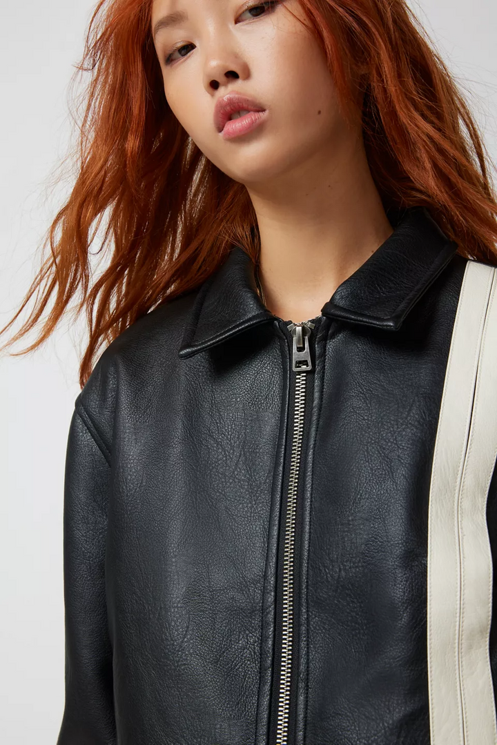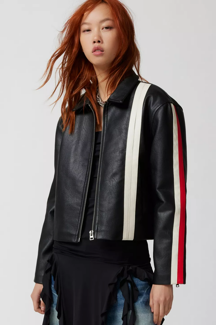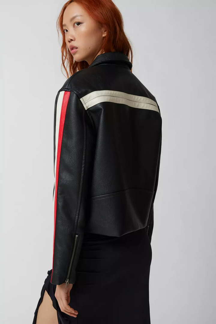 Buy Women Black Leather Stripe Racer Moto Jacket